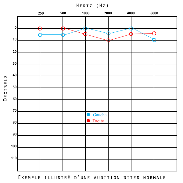 C’est une représentation graphique de votre capacité auditive, il permet de visualiser votre perte si elle existe. Votre audition est mesurée à différentes fréquences pour obtenir la courbe caractéristique. L’axe horizontal (en haut) représente les différentes fréquences exprimées en Hertz abrégé Hz. Les fréquences graves (dites basses, 125 Hz) sont situées à gauche et les fréquences aiguës (dites hautes, 8k / 8000) se trouvent à droite. L’axe vertical représente l’intensité sonore aux fréquences correspondantes, de faible (en haut) à forte (en bas). Les valeurs sont données en décibels, dont l’abréviation est dB(A). Une oreille saine commence à entendre des sons à partir de 0 dB(A) et atteint son seuil de douleur à environ 110 dB(A).
