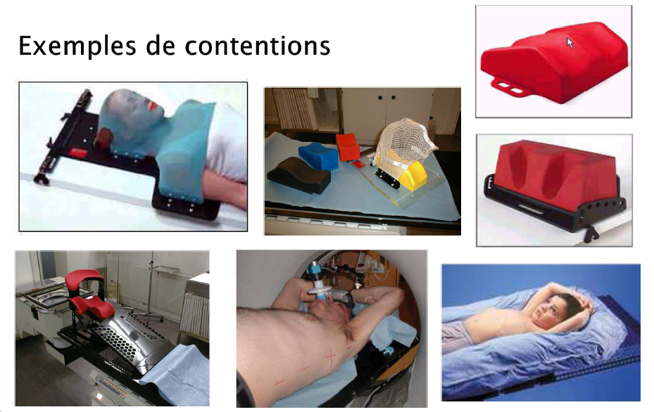 Une séance se déroule selon les mêmes étapes qu’une séance de protonthérapie. La première étape consiste à positionner læ patient⋅e dans la salle de traitement, de sorte à ce que la position soit confortable durant toute la séance tout en rendant la tumeur la plus accessible possible pour les rayons. On s’assure également que cette position soit la même d’une séance à l’autre pour avoir la même dose délivrée durant toute la durée du traitement. Pour cela, des outils peuvent être utilisés comme des supports pour les jambes, des coussins ou encore des marques sur la peau. L’image ci-dessous vous montre quelques exemples d’outils de contentions utilisés :